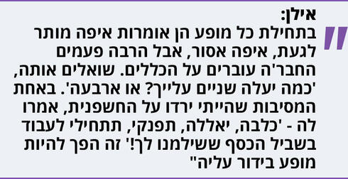 "ממש לא. התברר שבכל מסיבות הרווקים של החברים שלו, היו חשפניות. אחד החברים של בעלי אמר לי, 'עושים את זה פעם אחרונה לפני שמתחתנים' - אז מה זה אומר? שאפשר להביא ילדה צעירה? איך זה קשור לבחורה המסכנה הזאת? אני לא מצליחה להבין. הוא לא ידע מה להגיד לי חוץ מזה שככה זה, שאם לא מביאים למסיבת רווקים חשפניות, המסיבה שלך לא נחשבת. גוף של בחורה נהיה מחירון. זאת הייתה נקודת ציון מאוד חשובה בקשר שלנו, לא חשבתי שהגבר שלי יכול לקחת חלק במשהו כזה".