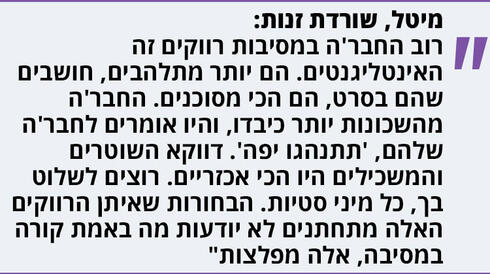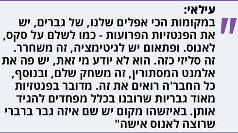 "כן. כל אחד רוצה להראות שהוא גבר, יש תחרות מי משפיל יותר, מי מכאיב יותר. יש להם מטרה לדרוס אישה, לגמד אותה, לייאש אותה, להביא אותה למצב הכי שפל. הם מוציאים את כל העצבים מהאישה בבית על הבנות במסיבה. הם מוציאים את כל התסכול, כי לאישה לא תמיד יש כוח והיא לא תעשה פעלולים שהם רוצים. אנשי ההיי־טק האלה, כל הכאילו־נורמטיביים ומלומדים, חושבים שעם הכסף שלהם הם מלכי העולם ואת לא שווה כלום. ואז גם נמחקת לך האישיות. הייתי בלי צלם אנוש, בלי נשמה, כמו בטרייה. בלי רגש, לא קר לך, לא חם לך, לא עצוב לך. אלה המקומות שמגיעים אליהם. זו מין מלכודת שאת לא מצליחה לצאת ממנה, כי מי ישלם את החשמל, אוכל לילדה, אז את עושה את זה עוד יום ועוד יום ואין אמון באף אחד".