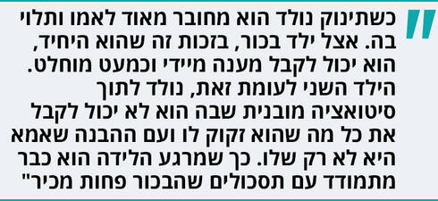 "כשתינוק נולד הוא מחובר מאוד לאימו ותלוי בה. אצל ילד בכור, בזכות זה שהוא היחיד, הוא יכול לקבל מענה מיידי וכמעט מוחלט. הילד השני, לעומת זאת, נולד לתוך סיטואציה מובנית שבה הוא לא יכול לקבל את כל מה שהוא זקוק לו ועם ההבנה שאמא היא לא רק שלו, כך שמרגע הלידה הוא כבר מתמודד עם תסכולים שהבכור פחות מכיר".