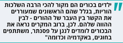 ד"ר בן שלמה: "אחים בכורים סוללים את הדרך לאחים שלהם. עם הבכורים, ההורים מרגישים שהם חייבים להשקיע במגוון של חוגים. לעומת זאת, עם שאר האחים רוב ההורים נוהגים לשחרר את הלחץ. הסיבה לכך היא כנראה ההבנה שהילד יגדל ויבחר להיות מה שהוא רוצה, ולא יפעל לפי רף הציפיות של ההורה ממנו.