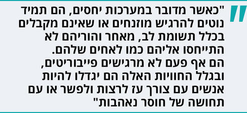 "זה בהחלט יכול להיות פצע שמפעיל קבלת החלטות, ובתוכן גם בחירת בן או בת זוג. החשש הוא משחזור של חוויית הילדות, כלומר להיות שקוף גם בזוגיות. מובן שיכול גם להיות בדיוק ההיפך - לחפש בן זוג שממוקד בי, לפתח זהות עוצמתית ונוכחות בלתי מתפשרת", היא מוסיפה.
