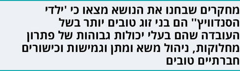 דוגמה לכך ניתן למצוא, למשל, במחקרים שערך פרופ' ג'ון גוטמן מאוניברסיטת וושינגטון, שהצביעו על כך שזוגות שבזמן ויכוח מסוגלים להתפשר מצד אחד ולהבהיר את עמדתם מצד שני, כפי שנוהגים רבים מ'ילדי האמצע', זוכים לחיי נישואים טובים וארוכים. "ילדי הסנדוויץ' מצליחים לרוב להיות בני זוג טובים בזכות העובדה שהם ניחנו ביכולות גבוהות לפתרון מחלוקות, לניהול משא ומתן ולגמישות, וכן לכישורים חברתיים טובים", מסבירה ד"ר מעוז.