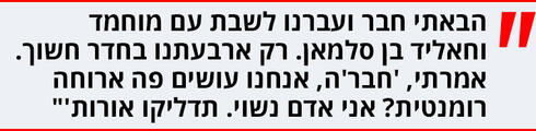 זו הייתה רק תחילתה של החוויה ההזויה של סבן באותו יום. "הבאתי איתי חבר אחד", הוא מספר, "ושנינו עברנו לשבת בחדר עם מוחמד וחאליד בן סלמאן. רק ארבעתנו בחדר חשוך. אמרתי, 'חבר'ה, אנחנו עושים פה ארוחה רומנטית? אני בן אדם נשוי. תדליקו אורות'. הם התחילו להביא מאזטים, אחד ועוד אחד, טעם גן עדן, הוא הרי מסתובב בעולם עם השף שלו. דחפו לנו מאזטים ו־MBS מסביר מה התוכניות שלו ומה דעתו על אלף נושאים. אחרי שעתיים הוא אומר, 'אוקיי, עכשיו נעבור לחדר השני לארוחת הערב'. מה ארוחת ערב? למי יש מקום לאכול עוד משהו".