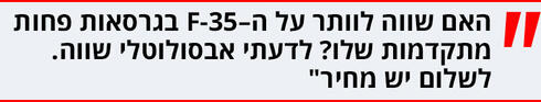 "אני לא יכול להביע דעה מלומדת, אבל מזכיר המדינה מייק פומפאו הבטיח שהיתרון הצבאי של ישראל, שזה חוק בארה"ב, יישמר. אם אכן כך, האם שווה לוותר על ה־F-35 בגרסאות פחות מתקדמות שלו? לדעתי אבסולוטלי שווה. אני משאיר את זה למומחים, כמובן אם ראש הממשלה נתניהו יאפשר למומחים להביע את דעתם, אבל אני חושב שאפשר למצוא את הפשרה. לשלום יש מחיר. אני חושב שנתניהו יאשר את מכירת המטוסים לאמירויות".