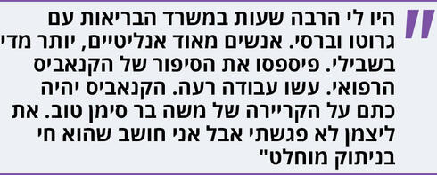 "מבחינת העוצמה הציבורית ועד הפרויקט הנוכחי, זה היה הדבר שעשה הכי הרבה אפקט. אבל זו עדיין לא הצלחה. ההצלחה תהיה כשנסיים עם זה. משרד הבריאות כשל באופן מחפיר. היו לי הרבה שעות במשרד הבריאות עם גרוטו וברסי. אנשים מאוד אנליטיים, יותר מדי בשבילי. פיספסו את הסיפור של הקנאביס הרפואי. עשו עבודה רעה. הקנאביס יהיה כתם על הקריירה של משה בר סימן טוב, גם אם זה לא נראה לו כרגע. מה שהם עשו לכמה אלפי המטופלים האלה לא יישכח. את ליצמן לא פגשתי אבל אני חושב שהוא חי בניתוק מוחלט. הוא איפשר את הדברים המחפירים שנעשו במשרד הבריאות בזמנו וברסי היה המנכ"ל של הדבר הזה".