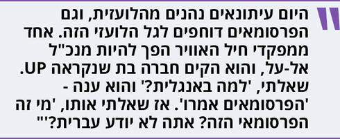 "גם הפרסומאים דוחפים לגל הלועזי הזה", הוא אומר. "אחד ממפקדי חיל האוויר הפך להיות מנכ"ל אל על, והוא הקים חברה בת שנקראה UP. שאלתי, 'למה באנגלית?' והוא ענה - 'הפרסומאים אמרו'. אז שאלתי אותו, 'מי זה הפרסומאי הזה? אתה לא יודע עברית?'"
