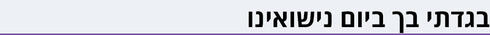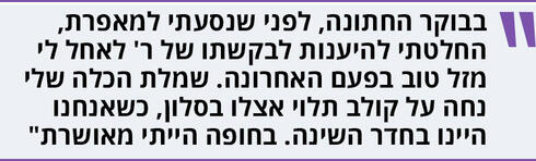 בבוקר החתונה, לפני שנסעתי למאפרת, החלטתי להיענות לבקשתו של ר' לאחל לי מזל טוב בפעם האחרונה. שמלת הכלה שלי נחה על קולב תלוי אצלו בסלון, כשאנחנו היינו בחדר השינה. בערב החופה הייתי הכי מאושרת בעולם, ואהבתי אותך באופן יוצא דופן. הייתי אופטימית. זהו, ימי השטויות באמת מאחוריי, חשבתי. אפשר להתחיל להיות מבוגרים.