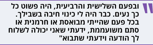 ברגע ההוא, הכול נפתח בינינו. היא סיפרה לי הכול וזה היה שבר גדול. משבר של חודשים. עד היום זה מרחף כמו צל מעל היחסים שלנו, וכנראה שזה ילווה אותנו גם הלאה.