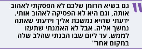 היא ואני הלכנו והתרחקנו. היא הייתה מושקעת באהבה החדשה שלכם ואני שקעתי בלנסות ולשקם את הריסות המיזם. ולמרות זאת, גם בשיא הרומן שלכם, לא הפסקתי לאהוב אותה, וגם היא לא הפסיקה לאהוב אותי. כמובן שלא ידעתי אז את טיב הרומן ביניכם. האמנתי לה כשאמרה שזה ידידותי בלבד. ידעתי שהיא נמשכת אליך וידעתי שאתה נמשך אליה. אבל לא האמנתי שתעזו לממש. עד ליום שבו הבנתי שהלב שלה במקום אחר. פשוט הבנתי.