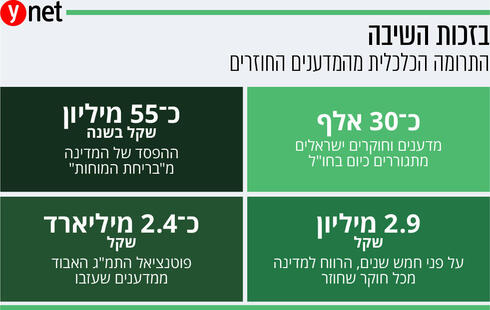 לפי חישובי "סאיינס אברוד" ומשרד הקליטה, כל חוזר "תורם" למדינה 2.9 מיליון שקל על פני חמש שנים, פי חמישה מהתרומה הממוצעת לנפש. פוטנציאל התמ"ג האבוד הכולל ממדענים שעזבו מגיע כבר לאורך השנים ל־2.4 מיליארד שקל.