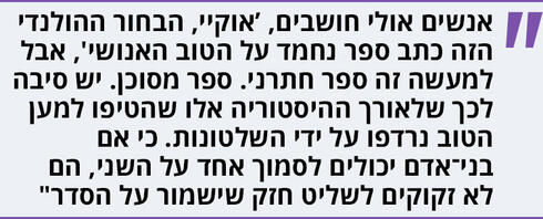"אז אנשים אולי חושבים, 'אוקיי, הבחור ההולנדי הזה כתב ספר נחמד על הטוב האנושי' – אבל לא, זה למעשה ספר חתרני. ספר מסוכן. יש סיבה לכך שלאורך ההיסטוריה אלו שהטיפו להאמין בטוב שבטבע האדם היו גם אלו שנרדפו על ידי השלטונות. אם אנשים לא יכולים לסמוך אחד על השני, אז הם זקוקים להיררכיה, הם זקוקים לאי־שוויון, הם זקוקים לשליט חזק שישמור על הסדר. לכן אלו שבשלטון מפחדים מספרים כמו זה, כי הם יודעים מה המשמעות שלהם מבחינתם".