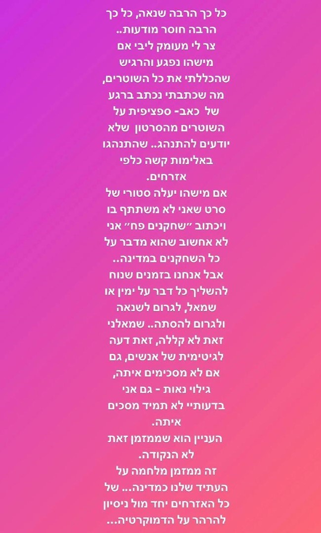השחקן שלקח אתמול חלק בהפגנות כתב על מה שראה וחווה מחוץ לביתו: "אז היום מימשתי את הזכות שלי כאזרח שומר חוק לצאת ולהפגין ליד הבית שלי, קילומטר אחד מהבית ולא מטר יותר. יצאתי עם מסיכה, והדבר הראשון שראיתי זה שוטרים מרביצים למפגינים, שוברים להם טלפונים ומצלמות, שוטרים על סוסים שדוהרים לכיוון בחורות שמתות מפחד ועוד רגע עולים עליהן ופוצעים אותן. כששאלתי את אחד השוטרים 'אחי למה באלימות?' הוא הרשה לעצמו להסתובב אלי ולאיים עלי שאסתום את הפה-אחרת...??"