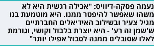 מי שמכירה היטב את הצורך הרגשי באכילה היא נעמה פסקה-דיוויס (34), בלוגרית ואקטיביסטית של דימוי גוף חיובי. "אכילה רגשית היא לא משהו שאפשר להיפטר ממנו. היא מוטמעת בנו מגיל צעיר ובשילוב האידיאלים החברתיים ש'שמן זה רע' - היא יוצרת בלבול וקושי, וגורמת לאלו שסובלים ממנה לסבול אפילו יותר", אומרת פסקה-דיוויס, שבנוסף לשאר תפקידיה מנהלת גם את קבוצת הפייסבוק "וידויים של שמנות" שמטרתה אחת: לתמוך בנשים שמנות ולעודד אותן לפרוק את אשר על ליבן, והכול ברוח ה"בודי פוזיטיב" ללא אזכור של דיאטות או ניתוחים למיניהם.