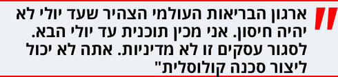 "העובדות הן כאלה - ארגון הבריאות העולמי הצהיר שעד יולי הבא לא יהיה חיסון. מזה מתחילים. אני מכין תוכנית עד יולי הבא. בואו נראה מה קורה אחרי שמחת תורה. לסגור עסקים זאת לא מדיניות. אתה לא יכול ליצור סכנה קולוסלית. אם יש עומסים בבתי חולים - תטפל בהם. אתה לא יכול לסגור את כל המערכת אם הבעיה היא רק בנהריה. אנחנו מומחים לנתונים, אנחנו קליינטים קשים אבל גם פטריוטים גדולים. אנחנו מקבלים היום חוסר אמינות במערכת שעליה מולבשים שיסוי ופירוד בעם. אבל אנחנו כאן כדי לשנות".