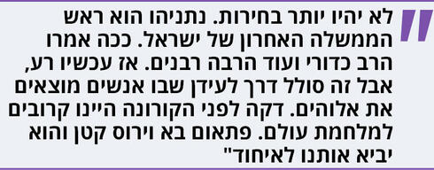 "אני מתכוון שהבורא הביא וירוס קטן שהורס את העולם הישן ולא בכדי. בית המקדש השלישי והאחרון גם יהיה חלק מזה, ככה פשוט בלי מלחמות". אני שואלת אותו למי הוא יצביע בבחירות ומה הוא חושב על התפקוד של ראש הממשלה שלנו, והוא אומר במסתוריות "לא יהיו בחירות".
