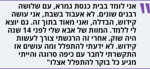 "המוות של אבא שלי לפני 14 שנה היה שוק. אחרי זה הרגשתי צורך לעשות קידוש. לא ידעתי להתפלל ומה עושים, אז התקשרתי לחבר עם כיפה סרוגה והייתי מגיע כל בוקר להתפלל אצלו בגבעתיים, ואחר כך חוזר למנחה ולערבית".