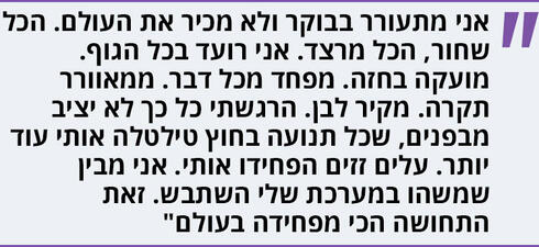 "אני מתעורר בבוקר ולא מכיר את העולם. הכל שחור, הכל מרצד. אני רועד בכל הגוף. מועקה בחזה. יש לי תחושות פיזיות שאני חי על ספינה בלב סערה. מיטלטל מצד לצד. מפחד מכל דבר. ממאוורר תקרה. מקיר לבן. הרגשתי כל כך לא יציב מבפנים, שכל תנועה בחוץ טילטלה אותי עוד יותר. עלים זזים הפחידו אותי. אני מבין שמשהו במערכת שלי השתבש. זאת התחושה הכי מפחידה בעולם".