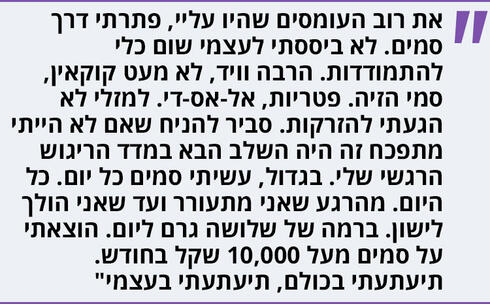 "נכון. זאת הרבה עבודה וגם הרבה כסף. השקעתי בסמים את כל הכסף שהרווחתי. אני מאמין שהוצאתי על סמים מעל 10,000 שקל בחודש".