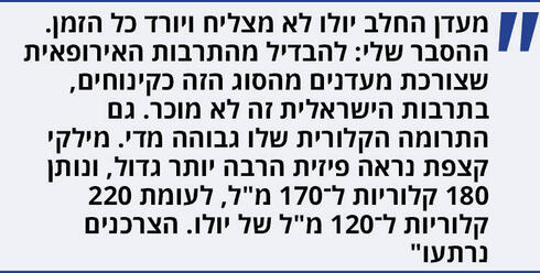 "יולו. בשוק של מעדני חלב בטעם שוקולד, כשהצרכן מקבל סוכר וקלוריות, מוצרים עם צימקאו, כשאפילו מילקי הוא בטעם שוקולד ולא עם שוקולד אמיתי – באה חברה כמו תנובה עם מוצרי שוקולד איכותיים, השקעה אדירה, והמוצר לא מצליח ויורד כל הזמן. לכל אחד יש את ההסבר שלו. ההסבר שלי: להבדיל מהתרבות האירופאית שצורכת מעדנים מהסוג הזה כקינוחים, בתרבות הישראלית זה לא מוכר. גם התרומה הקלורית שלו גבוהה מדי. מילקי קצפת נראה פיזית הרבה יותר גדול, ונותן 180 קלוריות ל־170 מ"ל, לעומת 220 קלוריות ל־120 מ"ל של יולו, שגם יש בו הרבה יותר סוכר. הצרכנים נרתעו.