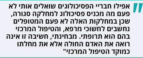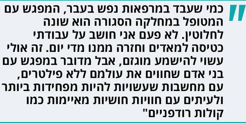 "ודאי ששאלתי את עצמי, ואני ממשיך לשאול את זה גם היום. צריך להבין שלעבוד במחלקה סגורה זה כמו לחיות בתוך שיר ולהיות פתוח לערוצי חשיבה אסוציאטיביים ולעיתים גם פרימיטיביים ולא לוגיים, ואני באמת מאמין שלפעמים צריך לקחת מרחק מהמקום הזה. אגב, בהגדרת התפקיד שלהם רוב הצוותים, שאליהם יש לי הערכה רבה, אינם קרובים למטופלים בדומה לאופן שבו הפסיכולוגים קרובים אליהם. ייתכן מאוד שעבודה במחלקות הסגורות דורשת תחלופה של אחת לכמה שנים, אבל זה נכון לכל מקצוע".