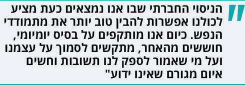 "אני לא חושב שעבודתי שונה מאיש מקצוע במחלקה המתמקדת בגוף. מובן שבעבודה שמתמקדת בנפש יש שיקוף רב יותר על מה שאנחנו עושים וכיצד זה משפיע, אבל החולי והמצוקה הם אמיתיים ולא דמיוניים, כפי שאולי יש שמציירים אותם. עד שלא נכניס ל'בתי המשוגעים' את אור השמש - נמשיך לפחד ממה שמתרחש שם. כשאני רואה את צוות הסיעוד, את הצוות הרפואי ואת המטפלים בריפוי בעיסוק במהלך עבודתם, אני מלא הערכה לכל מה שנעשה ומבין מה זו חמלה וסבלנות, גם בתנאי קצה. עם זאת, ברור לכל בר דעת כי חצי משרת פסיכולוג למחלקה של 55 מטופלים זו טיפה בים".