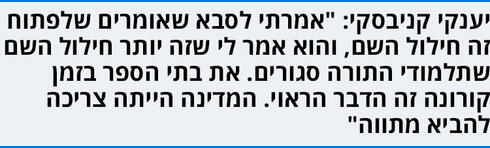 "אמרתי לסבא שאומרים שזה חילול השם, והוא אמר לי שזה יותר חילול השם שתלמודי התורה סגורים. תמיד אפשר להגיד 'חילול השם'. אפשר לומר שזה שאנחנו לא הולכים לצבא – זה גם חילול השם. אנחנו לא נהיה חילונים בגלל מה שיגידו. לפתוח את בתי הספר בזמן קורונה זה הדבר הראוי. המדינה הייתה צריכה להביא מתווה, אבל באין־מתווה אנחנו נזהרים ומי שלא נזהר הוא פושע. יש עליו דין רודף. הרמטכ"ל יצא לאימון ענק בגבול ואמר שזה שווה גם אם יהיו אלף נדבקים. מבחינתנו זה אותו דבר. לימוד תורה זה דחוף כמו להיערך למלחמה. זה ערך שחשוב לנו. אני מבין למה חילונים לא מבינים את זה, אבל אנחנו לא שהידים שרוצים להדביק את המדינה בקורונה. אנחנו רצינו הסדר עם המדינה".
