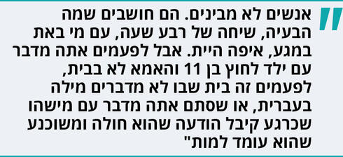אחרי שעתיים עם המסכה כבר הרגשתי כמו שעון נוזלי בציור של דאלי ולא הצלחתי להבין איך הבנות מחזיקות מעמד. מתברר שלכל אחת מהן יש סיפור שהמחיש לה כמה חשובה העבודה שלה. מהמתשאלת שהרגישה בקול של הנחקרת שמשהו קרה, עד שהבינה שלפני שלושה שבועות נולד לה תינוק מת, אז לא, אי־אפשר להכניס אותה סתם ככה לבידוד. או זאת שאת מגלה שהיא שכלה את אמה לפני כמה שעות, ועכשיו צריכה להיכנס לבידוד, ולכי תסבירי לה שאמא שלה תיקבר בלעדיה. כשקורים דברים כאלו הן נזכרות שאולי בעצם טוב שמישהי כמוהן ענתה, מישהי עם טקט ויכולת אמפתית שתבהיר לבן אדם השבור הזה שהוא לא לבד. "אני לא גיבורה, אני כל יום מתקשרת למפקדת שלי ואומרת נו, מתי חוזרים?" אומרת נעמה, "אבל אני מזכירה לעצמי שבמלחמה הזו, מה לעשות, זה אחד התפקידים הכי נחוצים, וזו המלחמה שקיבלתי".