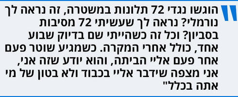 "אז כבר הרמתי ידיים, הבנתי שאין עם מי לדבר, כל ההתנהלות הייתה בושה. בתחנת המשטרה התייחסו אליי כמו מלך. הם מקצוענים שעשו את העבודה שלהם. הרי גם אני וגם המשטרה היינו נבוכים מהאירוע. אתה יושב בחקירה עם החוקר והוא נבוך מה לשאול אותי, שנינו הבנו את זה. סידרנו את הדברים, ואני אומר לך שהגיעו אליי אחר כך תושבי סביון עם עוגות ותמכו בי".