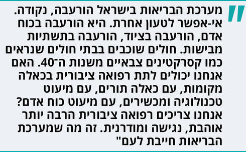 "יש לנו תשעה מיליון תושבים, מהם 13-12 אחוז מעל גיל 65, עם תחלואה שלא ראינו כמותה בעבר, כי פעם אנשים שחלו במחלות האלה פשוט מתו. היום אנשים חולים במחלות ממאירות קשות, ונדרשים לתרופות כל כך יקרות, מותאמות אישית. אפשר להגיד לציבור שאין לנו? גם נושא המכשור לא מספיק. צריך סי-טי, אפילו שניים, בכל חדר מיון. תאי לחץ לטיפול בפגיעות גפיים, בסוכרת, בפגיעות מוח. אלה דברים שחייבים להיות במדינה מודרנית. אני יכול להגיד לחולה, 'חכה במתח כמה חודשים, עד שיהיה לנו תור בשבילך'? זו רפואה חומלת? זו רפואה ציבורית ראויה?"
