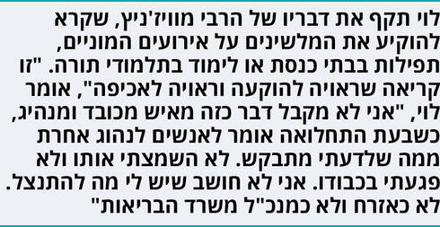 אבל לוי, אדם זהיר ומתון בדרך כלל, דווקא לא הזדרז להתקפל. "אין לי שום כוונות להתנצל", הוא אומר. "אין לי מאומה נגד הדת והחרדים, אבל אני לא מקבל דבר כזה מאיש מכובד, מוביל דעה ומנהיג, שבעת התחלואה הזו אומר לאנשים לנהוג אחרת ממה שלדעתי מתבקש. לא השמצתי אותו ולא פגעתי בכבודו. אמרתי את מה שהייתי אומר לכל אדם אחר בנסיבות האלה: בואו תשתפו פעולה. תתנהגו על פי מה שמבקשים מכם, כי אחרת זה לא יעשה טוב למדינה כולה ולכם. אתם חיים בשכונות צפופות. אתם נמצאים עם אנשים מבוגרים וילדים, ואני מצפה ממנהיגי דעה שיובילו להתנהגות אחראית. אני לא חושב שיש לי מה להתנצל. לא כאזרח ולא כמנכ"ל משרד הבריאות".