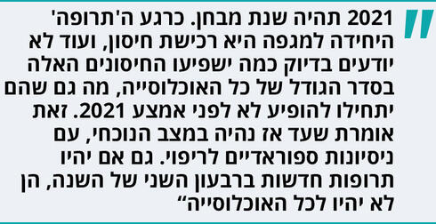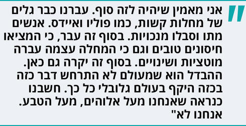 "2021 תהיה שנת מבחן. אנחנו אומרים שכרגע ה'תרופה' היחידה למגפה היא רכישת חיסון ועוד לא יודעים בדיוק כמה ישפיעו החיסונים האלה בסדר הגודל של כל האוכלוסייה, מה גם שהם יתחילו להופיע לא לפני אמצע 2021. זאת אומרת שעד אז נהיה במצב הנוכחי, עם ניסיונות ספוראדיים לריפוי. גם אם יהיו תרופות חדשות ברבעון השני של השנה, הן לא יהיו לכל האוכלוסייה. רק אחרי ניסויים קליניים נרחבים ורק אם יימצא שהחיסונים האלה בטוחים ויעילים - יוכלו לעבור לייצור המוני. זה ייקח זמן".