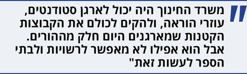 בתי הספר של הילדים, מצידם, לא רק שלא עוצמים עיניים בפני התופעה, אלא אפילו מעודדים אותה ומשתפים איתה פעולה, שכן מדובר בפתרון נוח למערכת החינוך הקורסת. "למרבה הפלא, גם המורים מעוניינים במסגרות האלה, וביקשו מאיתנו להעביר את הפרטים להורים נוספים בבית הספר. כי גם המורות 'נקרעות'. הן מלמדות בזום כשיש להן בבית ילדים משלהן שהן צריכות לדאוג להם. וללמד מעט ילדים זה הרבה יותר קל", אומר אחד ההורים.