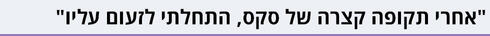 "זה היה מוזר. אחרי שנים עם אותו גבר, הגוף שלי קיבל את הצורה שלו, כמו שקע לתקע. פתאום זו הייתה טופוגרפיה אחרת. כשהוא נישק אותי בצוואר היו לי צמרמורות. נדלק בי משהו שהיה כבוי שנים. חיכיתי לשכב איתו, וזה היה בדיוק כמו שדמיינתי, אבל הקשר בינינו לא האריך. אישה אחרי גירושים היא כמו הר געש שרוצה לטרוף את העולם, ובזמנו חשבתי שאם אנחנו שוכבים, הוא כבר בן הזוג שלי. הכנסתי את זה למסגרות שהכרתי. בדיעבד, אני מבינה שיש צורות רבות של מערכות יחסים.