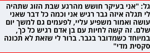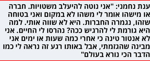 "זאת אחת הסיבות. אני בעיקר חושש מהרגע שבו היא תגלה איזה גבר רגיש אני וכמה כל דבר שאני עושה ואומר משפיע עליי, לפעמים גם למשך יום שלם. זה קשה לחיות עם בן אדם רגיש כל כך, במיוחד כשמדובר בגבר. ברור לי שזאת לא תכונה סקסית במיוחד".