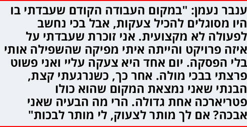 "במקום העבודה הקודם שעבדתי בו היו מסוגלים להכיל צעקות, אבל בכי נחשב לפעולה לא מקצועית. אני זוכרת שעבדתי על איזה פרויקט, והייתה איתי מפיקה שהשפילה אותי בלי הפסקה. יום אחד היא צעקה עליי, ואני פשוט פרצתי בבכי מולה. אחר כך, כשנרגעתי קצת, הבנתי שאני נמצאת במקום שהוא כולו פטריארכיה אחת גדולה. הרי מה הבעיה שאני אבכה? אם לך מותר לצעוק, לי מותר לבכות. מאותו הרגע החלטתי שאף אחד לא יגיד לי מתי לבכות. אנשים לא מבינים איזה מחיר זה גובה ממני לשמור את הבכי בפנים, בטח כשהרגשות שלך חזקים וסוערים כל כך".