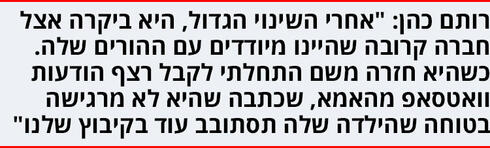 רותם: "אנחנו הורים לארבעה ילדים ובאנו להורות באמת עם לב פתוח. אבל יש מקומות מאתגרים וצובטים, כשאת הולכת עם הילדה שלך ומקבלת גם את המבטים וההתלחששויות מסביבכן, את אומרת לעצמך, 'יש סבירות גבוהה שככה החיים שלה הולכים להיראות, מבטים וצחקוקים מאחורי הגב'. את מבינה שבכל פעם שהיא תצא לרחוב תהיה עליה תשומת הלב הזאת, ואת רוצה שיראו בה את האישיות שלה, לא רק את זה".