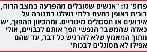 "אין ספק שהבכי הוא אמצעי תקשורת חיוני במיוחד, בעיקר בתקופה כמו עכשיו, כשרובנו נותרים ללא מילים. אגב, ילדים עם קשיי תקשורת בוכים פחות. אצל ילדים עם תסמונת דאון, לדוגמה, נמצאה פחות יכולת לאותת את צרכיהם, ונצפו פחות בכי במצבי מצוקה ופחות הבעות רגשיות", מוסיף גז.