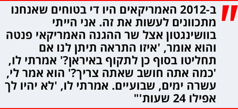 “לקראת האירוע עצמו, האמריקאים היו די בטוחים שאנחנו מתכוונים לעשות את זה. אני הייתי בוושינגטון אצל שר ההגנה האמריקאי פנטה והוא אומר, ‘תראה, אתם יודעים שאנחנו מתנגדים אבל איזו התראה תיתן לנו אם תחליטו בסוף כן לתקוף?’ אמרתי לו, ‘כמה אתה חושב שאתה צריך?’ הוא אמר לי, אני חושב עשרה ימים, שבועיים. אמרתי לו, ‘אין לך אפילו 24 שעות’. ואז אנחנו מדברים ואני מבין את הסאבטקסט”.