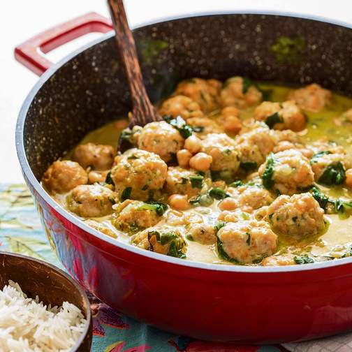 כדורי עוף ברוטב קארי עם גרגירי חומוס ותרד