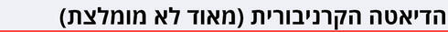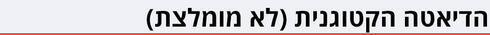 - כמות נמוכה מאוד של קלוריות: ירקות ופירות עם תכולה נמוכה של פחמימות כמו עלים ירוקים ופירות יער, מרקים מבוססי ירקות ומוצרי חלב ויוגורט 0% שומן.