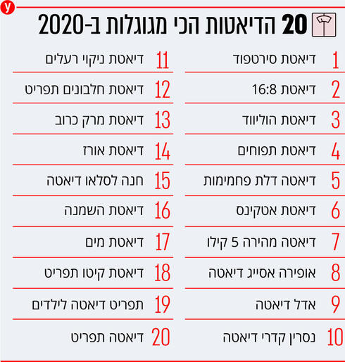 אם תהיתם אילו דיאטות עניינו אותנו במהלך 2020, לפי גוגל ישראל דיאטת סירטפוד הייתה המגוגלת ביותר במהלך 2020. כן, אותה דיאטה שאדל השילה בעזרתה עשרות קילוגרמים ממשקלה (אגב, אותה דיאטה תופסת גם את המקום התשיעי בחיפושים, הפעם תחת מילות החיפוש "אדל דיאטה"). אילו עוד דיאטות עניינו אותנו? הנה הנתונים (בסדר יורד):