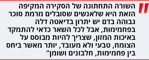 עוד נכתב בספר שהשורה התחתונה של הסקירה המקיפה הזאת היא שלאנשים שסובלים מרמת סוכר גבוהה בדם יש יתרון בדיאטה דלה בפחמימות, אבל לכל השאר כדאי להתמקד באיכות המזון יותר מאשר ביחס בין פחמימות, חלבונים ושומנים. "כל אחד צריך לבחור את השיטה שמתאימה לו, אבל מה שחשוב יותר מהשיטה עצמה הוא איכות האוכל, שצריך להיות מבוסס על הצומח, טבעי ולא מעובד", חורצים החוקרים. "תזונה בריאה צריכה לכלול 10-7 מנות של פירות וירקות מגוונים ביום, תוך הקפדה על צריכת עלים ירוקים מדי יום. שמירה על עיקרון זה היא החשובה ביותר וחייבת להיות בכל תזונה ודיאטה בריאה".