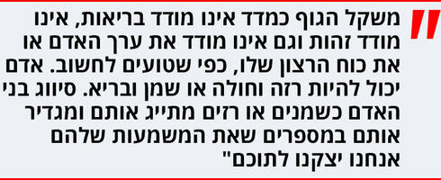 "אין עוררין שהשמנה הפכה עם השנים לאויב העם. היא מקוטלגת אצלנו כקשורה לכל תחלואי העולם, סוכרת, לחץ דם, טריגליצרידים, בעיות לב, בעיות כלי דם, ואפילו הקורונה הצליחה להצטרף לרשימה שהולכת ומתארכת עם השנים. השאלה העיקרית בעיניי אינה אם השמנה היא בעיה רפואית או לא, אלא אם קיימת דרך להתמודד איתה באופן בריא, ומהו המחיר הפיזי והרגשי שהאדם משלם על דרך זו. בפועל אנחנו כאנשי בריאות וטיפול לא באמת יודעים לעזור לאדם לרדת במשקל ולשמרו לאורך שנים. 95%-97% מעלים את משקלם חזרה תוך שנה עד חמש שנים. ומעבר לעליית המשקל, חוויית הכישלון והנזקים הנפשיים המצטברים מעצימים את ההשמנה, משבשים את התנהגויות האכילה, את המטבוליזם בגוף ומציפים את האשם והפחד, שהופכים להיות בני לוויה צמודים ומכבידים לכל האנשים שסוגיות המשקל מלוות את חייהם. במדינת ישראל אנשים שמנים כרזים עסוקים יום-יום במשקלם, וברצון ובניסיון אינסופיים לתקן אותו. נתונים אלה צריכים להדליק נורה אדומה.