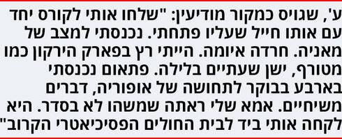 החייל אותו הפליל ע' נשאר גם הוא ביחידה ונכנס לכלא רק לאחר שסיים את השירות. ע' השתדל לשמור מולו על קור רוח, אבל כמה שבועות לפני השחרור קרס. "שלחו אותי לקורס יחד עם אותו חייל שעליו פתחתי. נכנסתי למצב של מאניה. לא ישנתי. חרדה איומה. הייתי רץ בפארק הירקון כמו מטורף, ישן שעתיים בלילה. פתאום נכנסתי בארבע בבוקר לתחושה של אופוריה, כאילו כל הכוכבים מסתדרים, כל החרדה נעלמת, והרגשתי שיש לי כוחות-על. כאילו אני יכול לקרוא מחשבות של אנשים. דברים משיחיים".