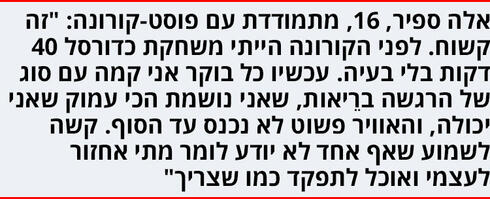 ואז הגיע היום המיוחל שבו אלה קיבלה סוף-סוף אישור שהקורונה חלפה, והיא יכולה לצאת מהבידוד. אבל זה גם היה היום שבו גילתה שהיא פשוט לא מסוגלת. "אמא הודיעה לי שאני יכולה לצאת מבידוד", משחזרת אלה. "הדבר הראשון שאמרתי לה הוא שאני עדיין לא מרגישה מספיק טוב לקום מהמיטה ולצאת".