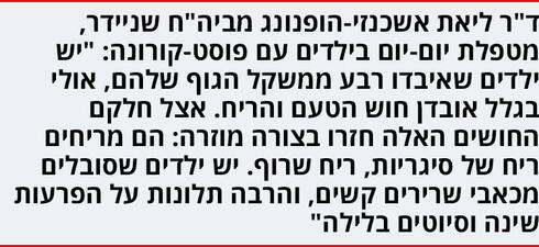 "זו אחת השאלות שעליהן עדיין אין לנו תשובה: האם המצוקה הנפשית של מחלימים שונה מזו של כל ילדי ישראל בקורונה. ייקח לנו זמן להשוות בין שתי האוכלוסיות ולראות את ההבדלים. לא ראינו חרדה או דיכאון מובהקים. את הקושי המובן של הילדים האלה לחזור לשגרה אנחנו מעדיפים להגדיר כ'תסמונת הסתגלות'".