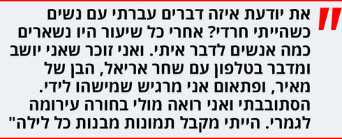 "זה נראה לי ילדותי. אינפנטילי קצת. אני כבר לא מצליח להתרגש מחיכוך אקראי. משהו חד־פעמי לא עושה לי את זה. את יודעת איזה דברים עברתי עם נשים כשהייתי חרדי? אחרי כל שיעור תמיד היו נשארים כמה אנשים לדבר איתי, לנשנש אותי קצת. ואני זוכר שאני יושב ומדבר בטלפון עם שחר אריאל, הבן של מאיר, ופתאום אני מרגיש שמישהו לידי. הסתובבתי ואני רואה מולי בחורה עירומה לגמרי. פשוט הוציאה את כולם מהחדר ונעלה את הדלת. אמרתי לשחר 'אחי, אני חוזר אליך'. ניסיתי להסתכל לה בעיניים — זה היה קשה — אמרתי לה 'מה?'