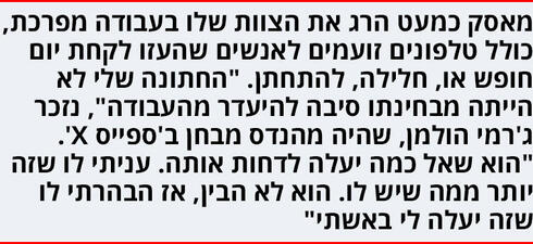 הדפוס המתכלב הזה, אגב, יהפוך לקבוע העיקרי בחייו של מאסק: הוא עובד כמו שאף אחד אחר לא מסוגל. "יש לו דחף לא ייאמן לעבוד 70־80־90 שעות בשבוע בלי הפסקה", סיפר דודו סקוט הלדמן שגם עבד איתו, לכתב 'וויירד'.