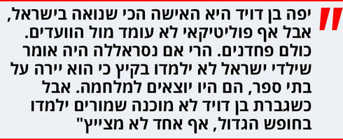 "זה שהיינו שנה עם הילדים בבית ואף אחד לא יוצא נגד גברת יפה בן דויד, שלא מוכנה שמורים ילמדו בחופש הגדול, מוכיח כמה הדיון הפוליטי עקום. היא הרי האישה הכי שנואה במדינה, אבל אף פוליטיקאי לא עמד מולה. אם נסראללה היה אומר שילדי ישראל לא ילמדו בקיץ כי הוא יירה על בתי ספר, כל הפוליטיקאים, מימין ועד המשותפת, היו יוצאים למלחמה. אבל כשיפה בן דויד דיברה - אף אחד לא צייץ. חוסר האמון של הפוליטיקאים בציבור הישראלי מונע מהם להיות קמפיינרים אפקטיביים בקרב על ההנהגה. הם לא מוכנים להכריז מלחמה על המערכת או להציע רפורמה שמזיזה למישהו את הגבינה. ההסתדרות היא היום המטרה הפוליטית הכי טובה בישראל. בטח אחרי ששלחו ילדות בנות שלוש ללמוד בזום".