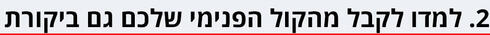 האם הקול הפנימי שלנו צריך להיות חיובי תמיד, רק להחמיא לנו ולפרגן? התשובה היא לא. אם אני מספר בדיחה חסרת טעם במסיבה או בארוחת ערב משפחתית ופתאום יש שתיקה בחדר, אני יכול לחשוב לאחר מכן מה השתבש וללמוד מכך איך לא להביך את עצמי שוב. אם קרתה לכם סיטואציה לא נעימה צריך לחוות אותה, ללמוד ממנה ולהמשיך הלאה. לא הייתם רוצים את החיים שלכם בלי הקול הפנימי שלפעמים אומר לכם דברים נעימים פחות. זה כמו להשיט סירה בים ללא הגעה או כיוון. המטרה היא לא לגרום להיעלמות הביקורת, אלא לא לאפשר לה לשלוט בכם ולהשתלט על הנפש. איך יודעים לא לעבור את הגבול? משמיעים את הביקורת, מנסים להשתפר וממשיכים הלאה.